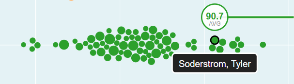 Soderstrom also showed off his arm. The graphic above shows arm strength amongst left fielders by how hard, in miles per hour, they throw. Soderstrom is in that second bundle with Alex Verdugo, Austin Hays, and Kyle Stowers.