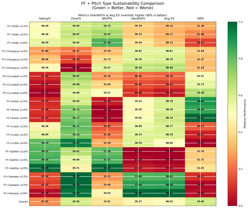 Compared to the overall arsenal baseline, fastball/sinker combinations generate fewer swings and misses, an outcome that might initially raise alarm in an era that prioritizes bat-missing.