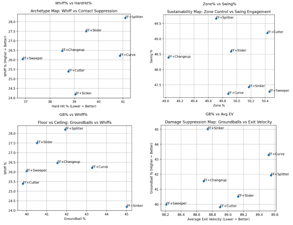 To explore that question, I analyzed pitcher data from 2023–2025, focusing on arsenals that pair a four-seam fastball with a secondary fastball offering at above 12%. The goal was not to crown a single “best” pitch mix, but to understand the tradeoffs between approaches that prioritize whiffs, low contact quality, command, and sustainability.