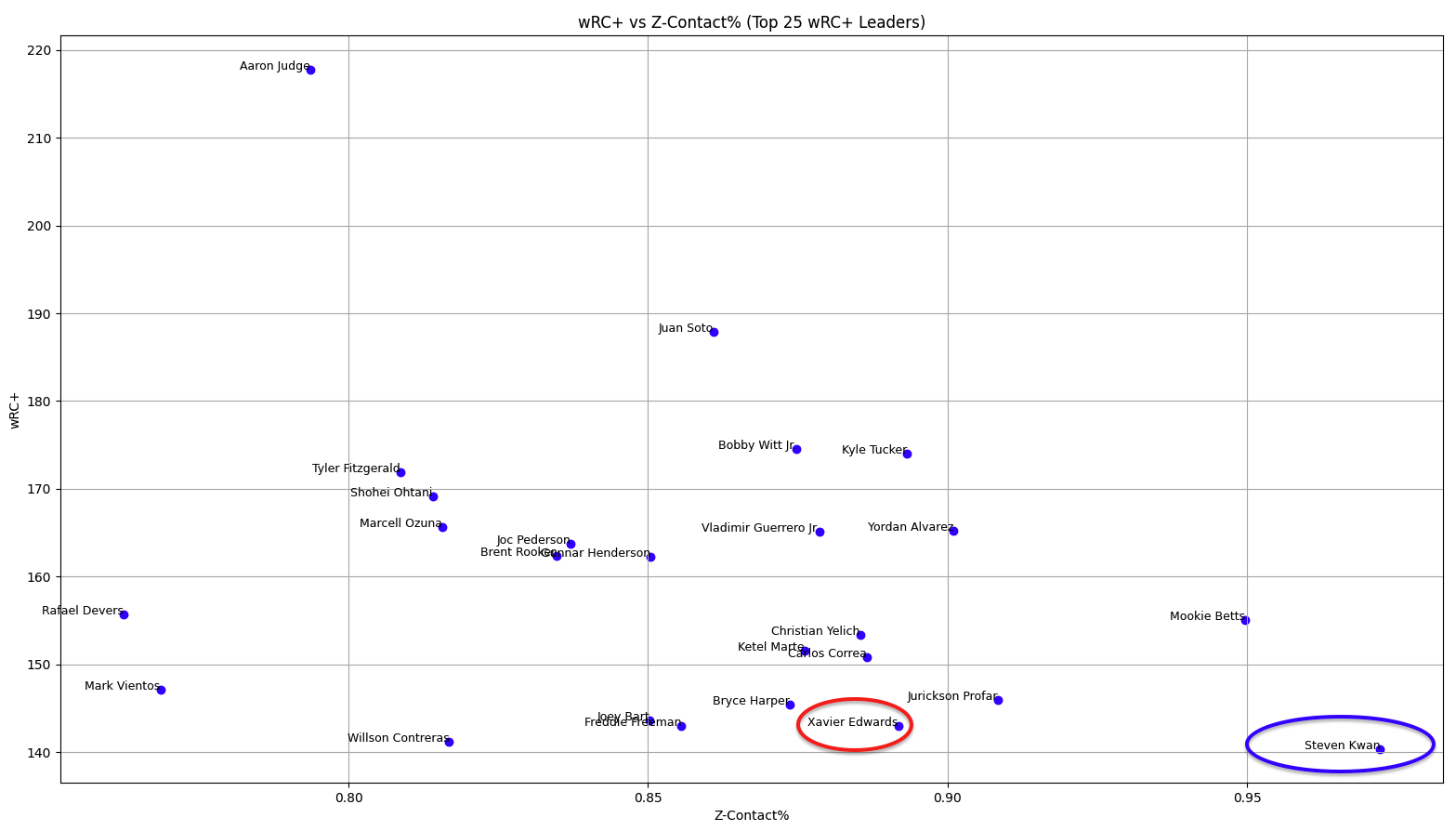 Here’s a look at the top 25 hitters by wRC+ by Barrel%. As you can see, Edwards has the lowest barrel rate of any hitter in the top 25. It’s also not very close. The lone player in his cluster is Steven Kwan. Kwan has put on a terrific season without power output thanks to his A1 ability to make contact. The Guardians outfielder ranks first among qualified hitters in Z-Contact% this season.