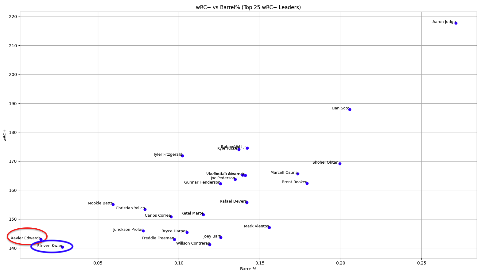 There’s a much looser correlation for Z-Contact% to wRC+ output but in the case of projecting Edwards for the future, this graph is very important. Kwan’s 97% Z-Contact rate is what is allowing him to be able to consistently sit among the best of the best when it comes to offensive production. Even though he’s not running into much power, he’s hitting the ball into play a ton, leading to production.