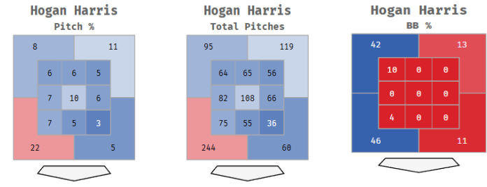 The graphic above shows the zone from the catcher’s perspective. Harris throws both his curveball and fastball inside to righties and pairs the two to keep batters off balance. The issue is his fastball command struggles. The pitch often creeps too far inside, leading to walks – as you see with the 42% and 46% on the far right graphic.