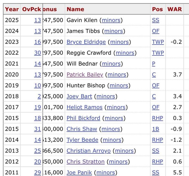 For a team that built a three-time World Series-winning roster on the shoulders of homegrown talent in the 2010s, it’s been a dry spell of successful draft picks. Outside of Heliot Ramos and Patrick Bailey, you’d have to go all the way back to 2011 to find a year the team got anything significant out of one of its top picks.