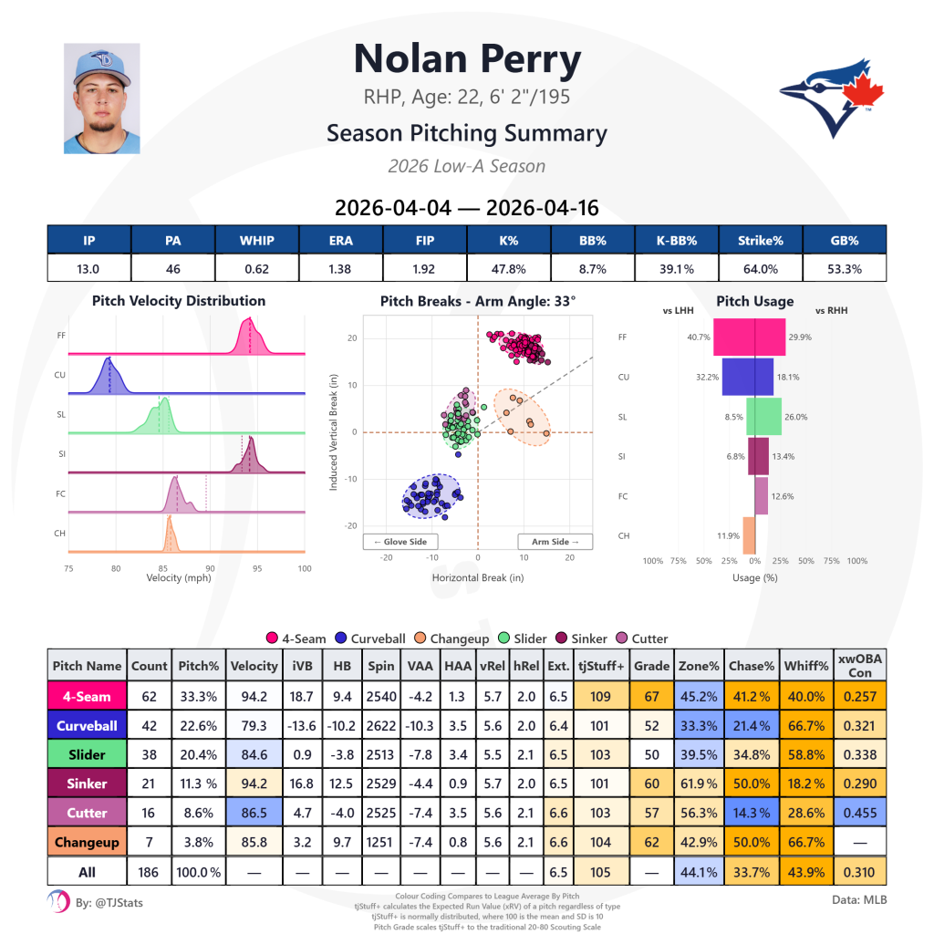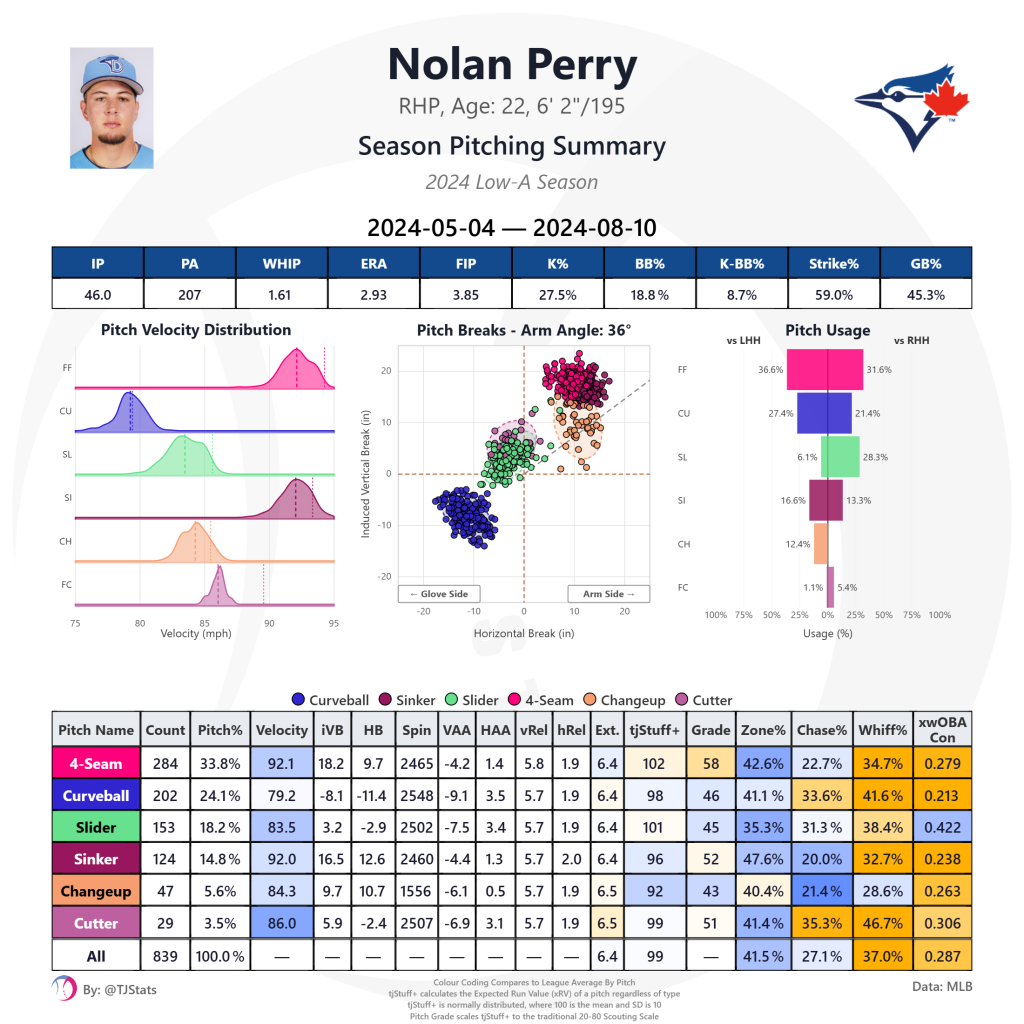 Perry is a former 12th-round selection by the Blue Jays out of Carlsbad High School in New Mexico back in 2022. His signing bonus was $200,000. Perry debuted for the Blue Jays in 2023 at the Florida Complex League and logged 38.1 innings while pitching to a 7.28 ERA/4.05 FIP. His 19.4 K-BB% suggested he pitched a lot better than the ERA would indicate.